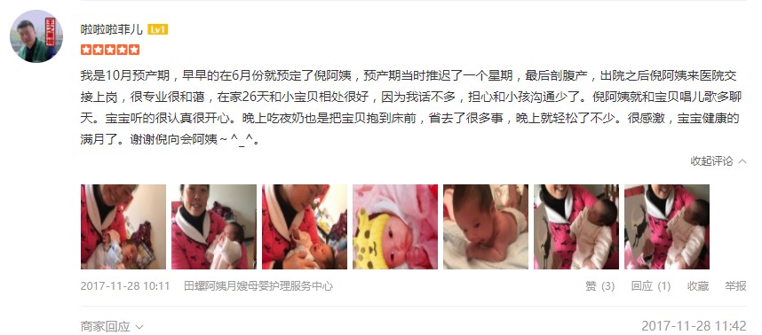 肖莉潘姐姐人特別好,情商高,業務熟練,知識面廣,善于與人溝通。對孩子特別耐心,對產婦護理特別細心,寶寶順順利利的度過了作為新生兒的第一個月,媽媽的身心也都得到了很好的恢復。感謝田螺阿姨推薦了這么好的老師來,我們都很感謝一個月來劉老師的付出,謝謝啦
